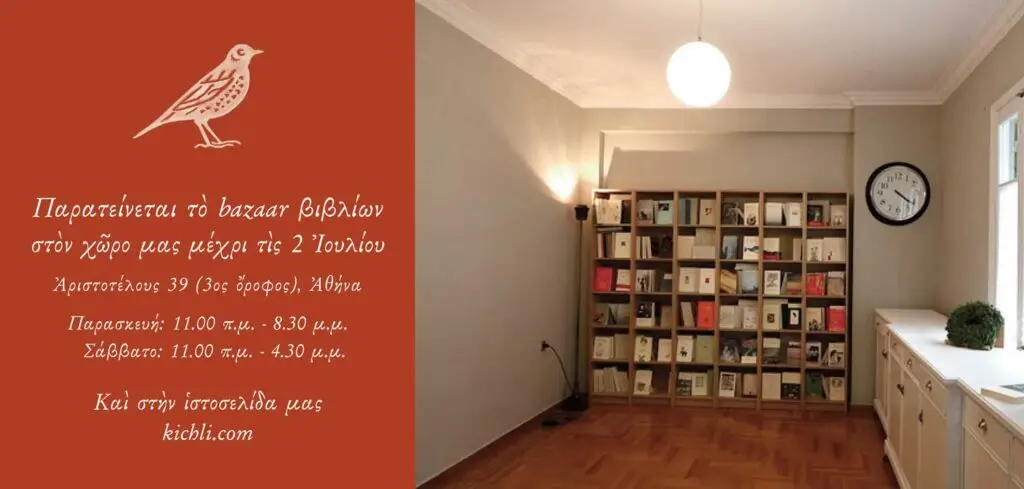 Αγαπητοί φίλοι, οι εκδόσεις Κίχλη σας προσκαλούν στο θερινό bazaar βιβλίων στον νέο τους χώρο, Αριστοτέλους 39 και Ηπείρου, Αθήνα, από την Τρίτη 28 έως και το Σάββατο 2 Ιουλίου. (Καθημερινά 11.00 – 8.30 μ.μ. και Σάββατο 11.00- 4.30 μ.μ.) Θα βρείτε στον χώρο μας όλα τα βιβλία μας με έκπτωση από 50% και πάνω και […]