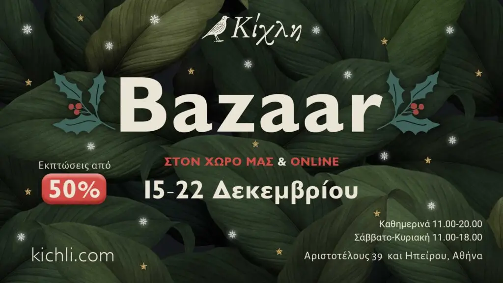 Σας περιμένουμε από τις 13 Δεκεμβρίου στο kichli.comκαι από τις 16 Δεκεμβρίου στο χώρο μαςμε τα βιβλία του καταλόγου μας σε πολύ καλές τιμές, βιβλιοφιλικές προτάσεις για τα χριστουγεννιάτικα δώρα σας και πολλές εκπλήξεις! Έκπτωση από 50% και άνω.* Ωράριο λειτουργίας του bazaar: Καθημερινά 11.00-20.00 Σάββατο-Κυριακή 11.00-18.00 *Εξαιρούνται τα βιβλία εντός ενιαίας τιμής βιβλίου.