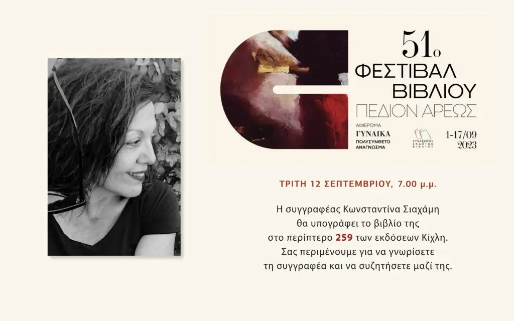 Την Τρίτη 12 Σεπτεμβρίου, στις 7.00 μ.μ. η ποιήτρια Κωνσταντίνα Σιαχάμη θα υπογράψει τα βιβλία της στο περίπτερο 259 των εκδόσεων Κίχλη.