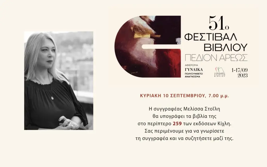 Την Κυριακή 10 Σεπτεμβρίου, στις 7.00 μ.μ. η συγγραφέας Μελίσσα Στοΐλη θα υπογράψει τα βιβλία της στο περίπτερο 259 των εκδόσεων Κίχλη.