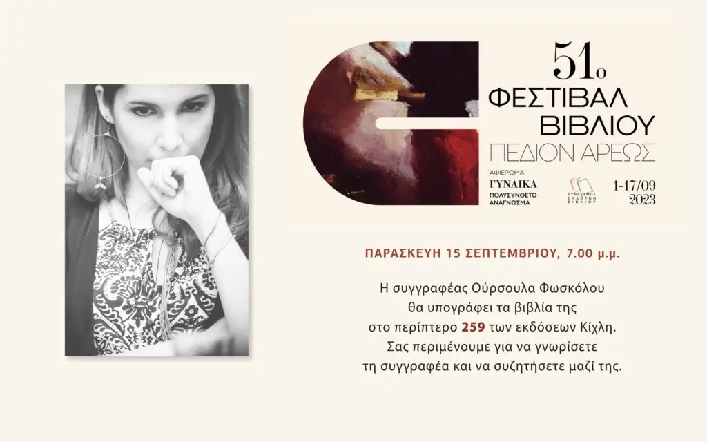 Την Παρασκευή 15 Σεπτεμβρίου, στις 7.00 μ.μ. η συγγραφέας Ούρσουλα Φωσκόλου θα υπογράψει τα βιβλία της στο περίπτερο 259 των εκδόσεων Κίχλη.