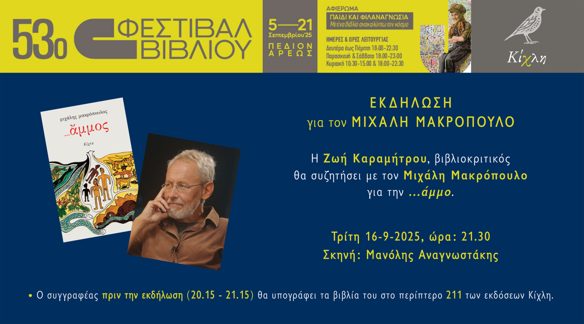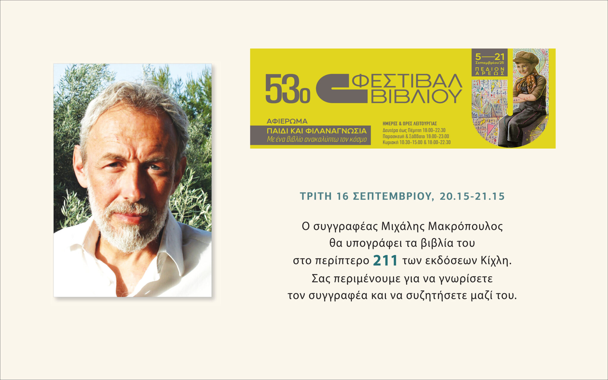 Ο συγγραφέας Μιχάλης Μακρόπουλος θα υπογράψει τα βιβλία του στο περίπτερο 211 των εκδόσεων Κίχλη.