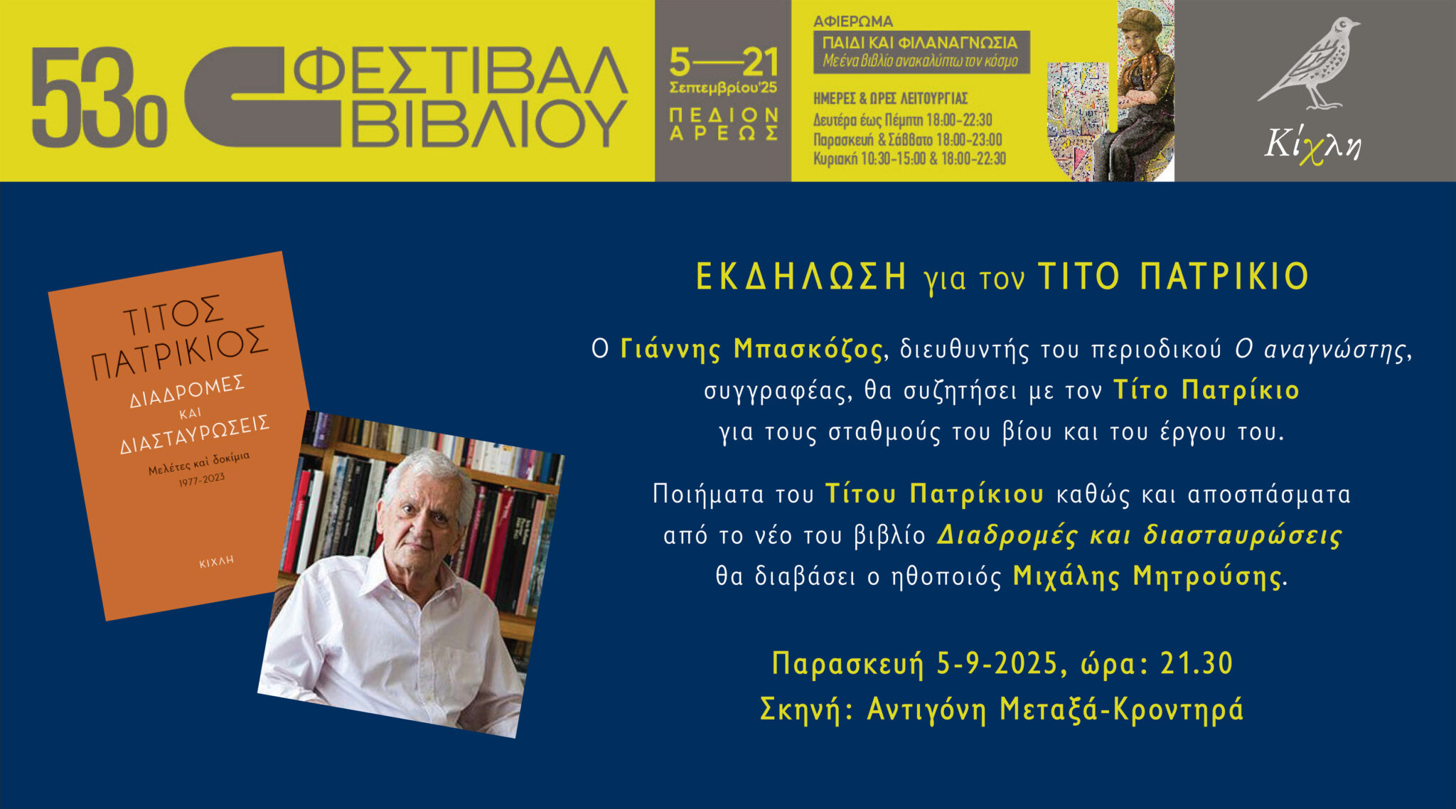 Ο Γιάννης Μπασκόζος θα συζητήσει με τον Τίτο Πατρίκιο για τους σταθμούς του βίου και του έργου του.
