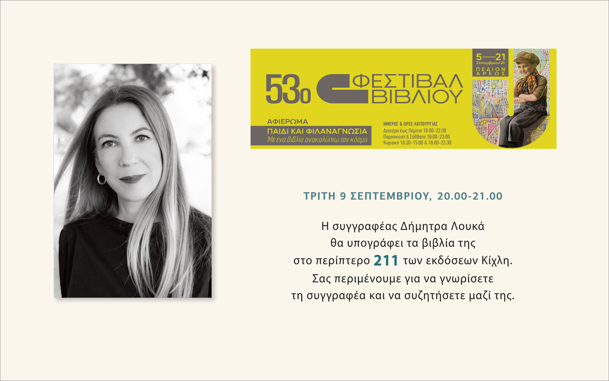 Η συγγραφέας Δήμητρα Λουκά θα υπογράψει τα βιβλία της στο περίπτερο 211 των εκδόσεων Κίχλη.