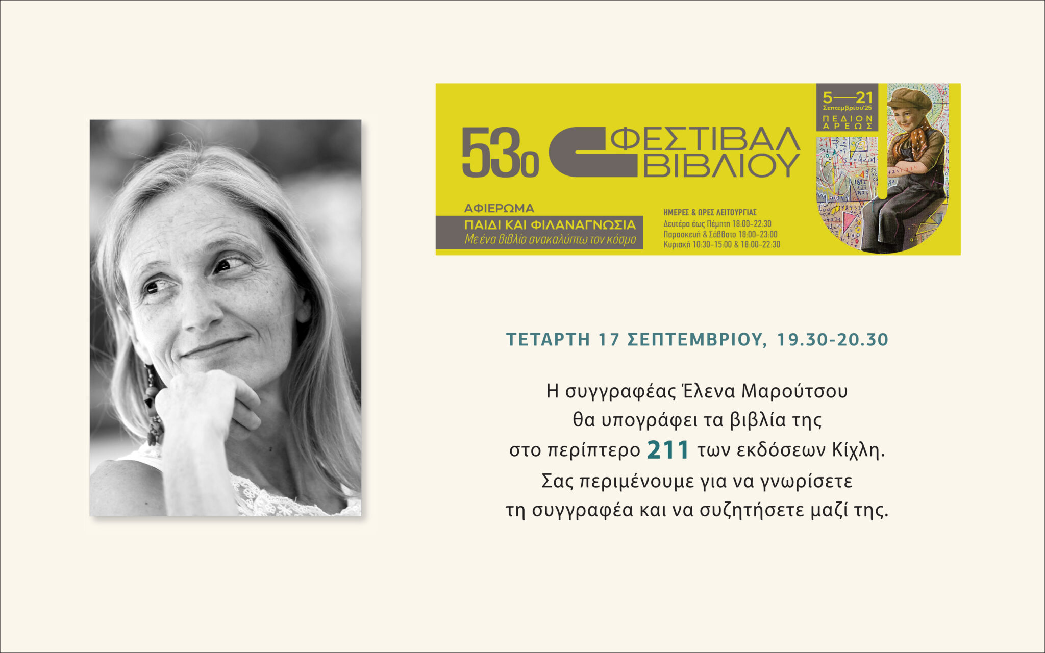 Η συγγραφέας Έλενα Μαρούτσου θα υπογράψει τα βιβλία της στο περίπτερο 211 των εκδόσεων Κίχλη.