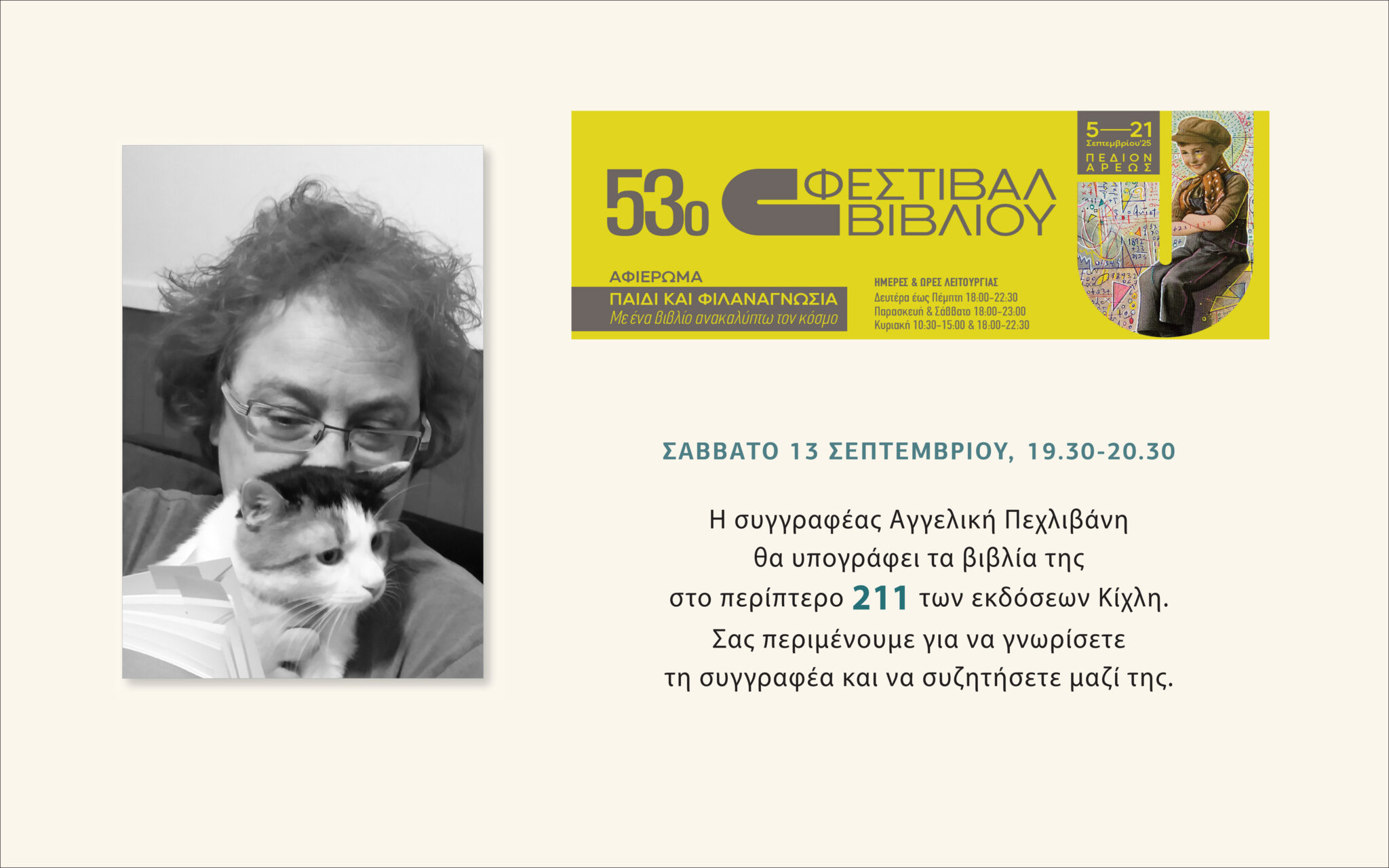 Η ποιήτρια Αγγελική Πεχλιβάνη θα υπογράψει τα βιβλία της στο περίπτερο 211 των εκδόσεων Κίχλη.