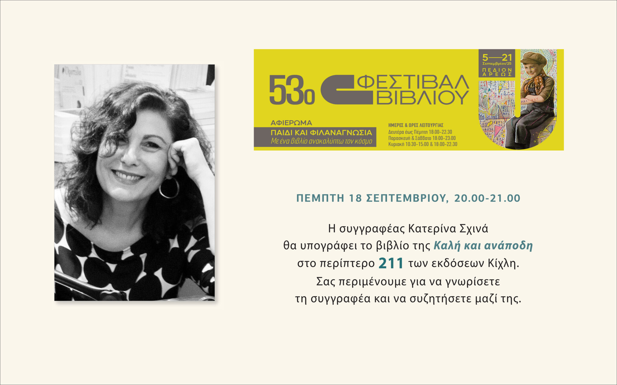 Η συγγραφέας Κατερίνα Σχινά θα υπογράψει το βιβλίο της Καλή και ανάποδη στο περίπτερο 211 των εκδόσεων Κίχλη.