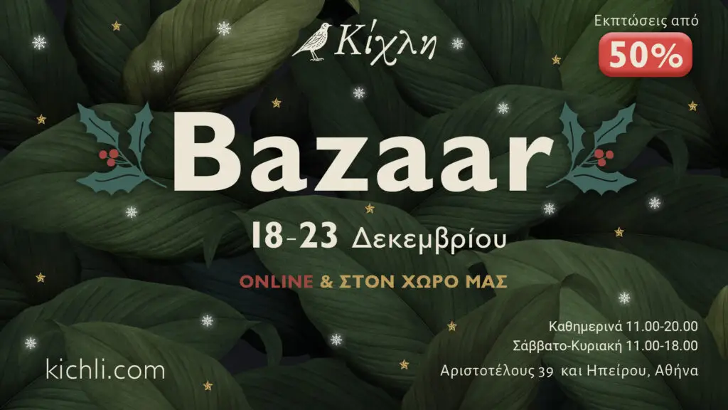 Οι εκδόσεις Κίχλη διοργανώνουν Χριστουγεννιάτικο Bazaar 18 – 23 Δεκεμβρίου στον χώρο τους, αλλά και online. Θα βρείτε όλα μας τα βιβλία με έκπτωση από 50% και άνω.* Ωράριο λειτουργίας του bazaar: Καθημερινά 11.00-20.00 Σάββατο-Κυριακή 11.00-18.00 *Εξαιρούνται τα βιβλία εντός ενιαίας τιμής βιβλίου.