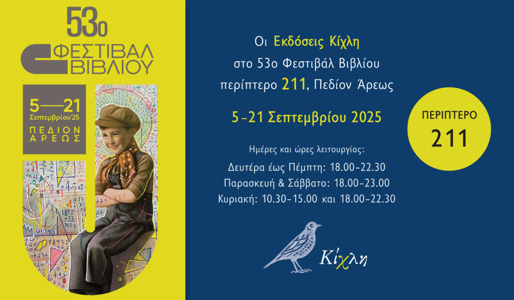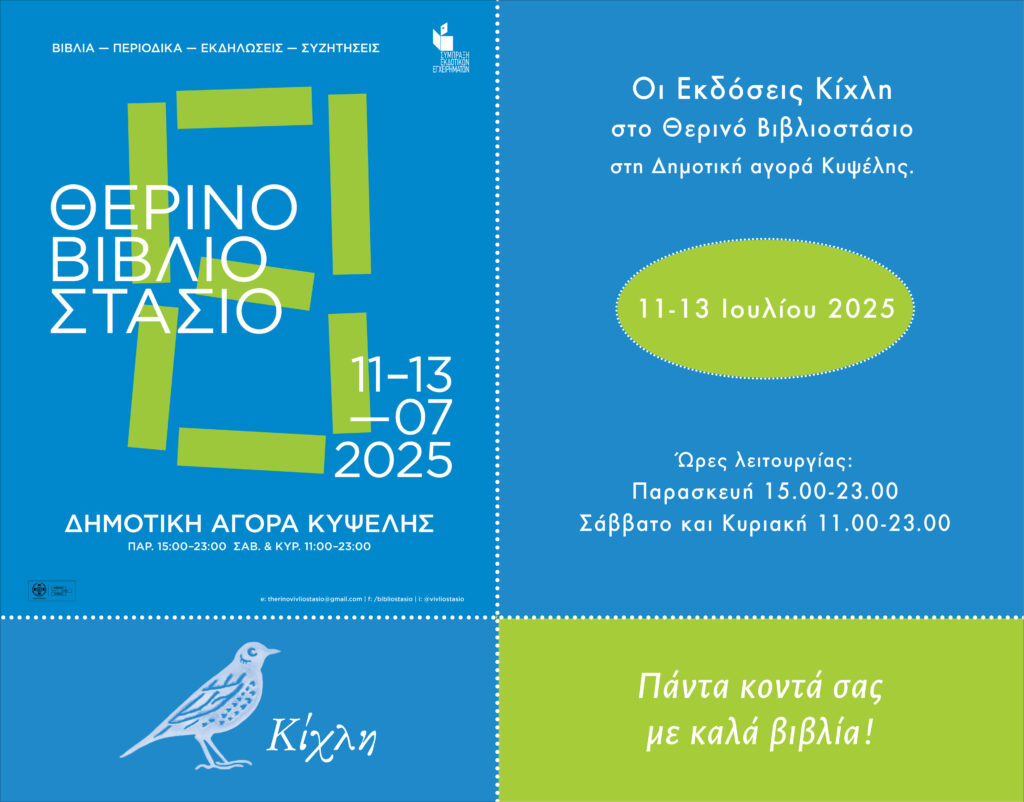 Από 11-13 Ιουλίου οι εκδόσεις Κίχλη θα βρίσκονται στο 8ο Θερινό Βιβλιοστάσιο στη Δημοτική Αγορά Κυψέλης Σας περιμένουμε στο περίπτερό μας με ευρεία γκάμα παλαιότερων και νεότερων βιβλίων του καταλόγου μαςκαι ειδικές προσφορές. Ώρες λειτουργιας: Παρασκευή 15.00-23.00Σάββατο-Κυριακή 11.00-23.00
