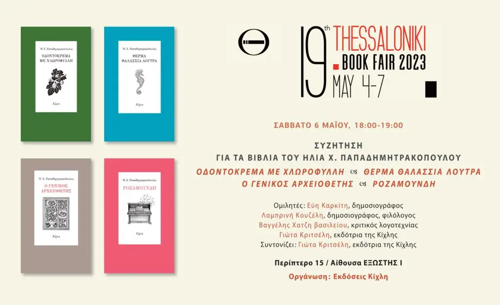 Συζήτηση για τα βιβλία “Οδοντόκρεμα με χλωροφύλλη”, “Θερμά θαλάσσια λουτρά”, “Ο Γενικός Αρχειοθέτης”, “Ροζαμούνδη” του Ηλία Χ. Παπαδημητρακόπουλου, το Σάββατο 6 Μαΐου, 18:00-19:00, περίπτερο 15, αίθουσα Εξώστης Ι.