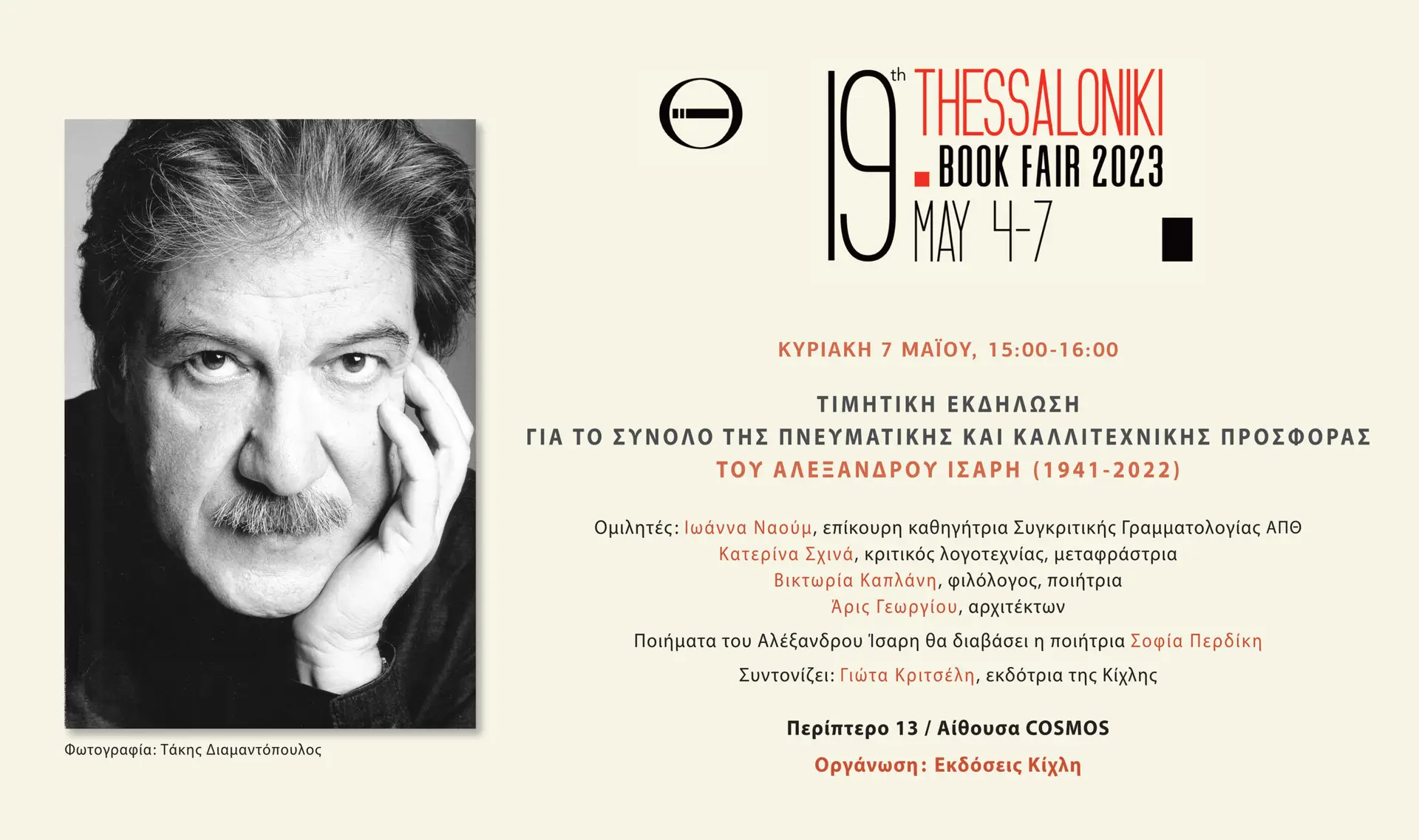 Τιμητική εκδήλωση για το σύνολο της πνευματικής και καλλιτεχνικής προσφοράς του Αλέξανδρου Ίσαρη (1941-2022) την Κυριακή 7 Μαΐου, 15:00-16:00, στο περίπτερο 13, αίθουσα COSMOS.