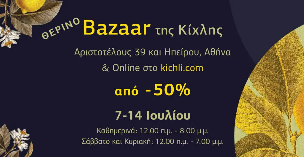 Σας προσκαλούμε στο ΘΕΡΙΝΟ BAZAAR που διοργανώνουμε στον χώρο μας (Αριστοτέλους 39, Αθήνα) αλλά και online στο kichli.com.